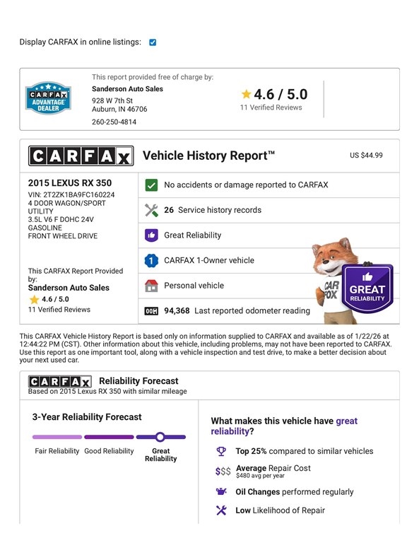 FRONT WHEEL DRIVE RX 350 with heated and cooled leather seats, moonroof, navigation, CD with satellite radio, Bluetooth, blind spot monitor, 19 inch wheels, backup camera, keyless entry, power seats, power hatch, and more. This Lexus has been serviced and detailed in our shop. Sanderson Auto Sales has a one price policy. We take the hassle of haggling away by advertising our best price up front. Also, we will never try to sneak in a Documentation Fee or any other type of bogus charge to the final paperwork. Please keep this in mind when shopping for your next vehicle.