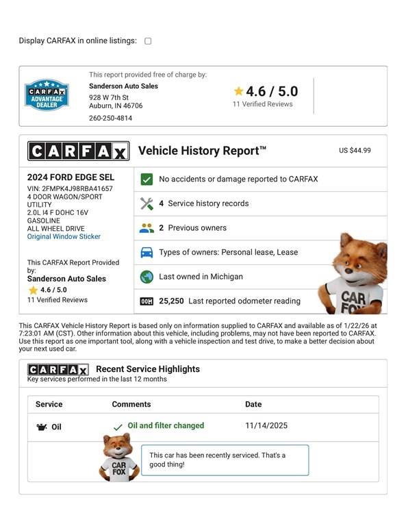 ALL WHEEL DRIVE SEL with the 2.0L Ecoboost, heated leather seats, heated steering wheel, panoramic moonroof, 18 inch wheels, backup camera, power seats, lane keep, blind spot monitor, Co-Pilot360, Fordpass Connect, Wi-Fi, Apple Carplay, Android Auto, and more. This Edge has been serviced and detailed in our shop. Sanderson Auto Sales has a one price policy. We take the hassle of haggling away by advertising our best price up front. Also, we will never try to sneak in a Documentation Fee or any other type of bogus charge to the final paperwork. Please keep this in mind when shopping for your next vehicle.