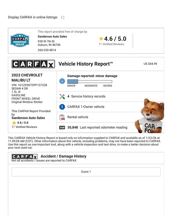 LT equipped with the economical 1.5L turbo, panoramic moonroof, heated seats, 19 inch wheels, satellite radio, blind spot alert, lane keep assist with lane departure warning, forward collision alert, rear cross-traffic alert, Bluetooth, keyless entry with remote start, backup camera, Apple Carplay, Android Auto, power seat, and more. This Malibu has been detailed and serviced in our shop and is 100% ready to go. Sanderson Auto Sales has a one price policy. We take the hassle of haggling away by advertising our best price up front. Also, we will never try to sneak in a Documentation Fee or any other type of bogus charge to the final paperwork. Please keep this in mind when shopping for your next vehicle.