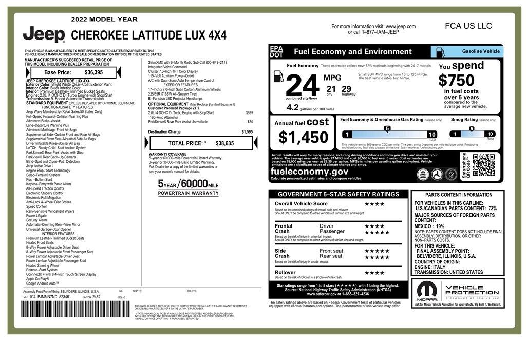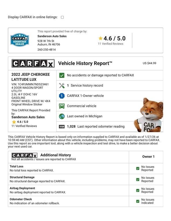 ALL WHEEL DRIVE LATITUDE LUX with the 2.0L turbo, heated leather seats, 17 inch wheels, heated steering wheel, backup camera, forward collision warning, blind spot detection, cross path detection, keyless entry with remote start, power seats, power hatch, Apple Carplay, Android Auto, satellite radio, Bluetooth, and more. This Jeep has been serviced and detailed in our shop. Sanderson Auto Sales has a one price policy. We take the hassle of haggling away by advertising our best price up front. Also, we will never try to sneak in a Documentation Fee or any other type of bogus charge to the final paperwork. Please keep this in mind when shopping for your next vehicle.