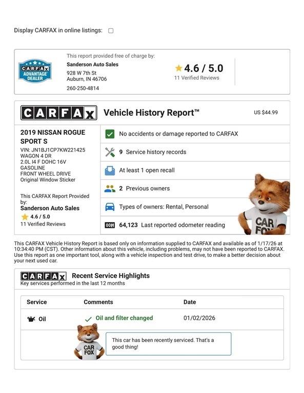 FRONT WHEEL DRIVE SPORT S with BRAND NEW TIRES, blind spot detection, rear cross-traffic alert, Bluetooth, backup camera, keyless entry, Apple Carplay, Android Auto, and more. This Rogue Sport has been serviced and detailed in our shop. Sanderson Auto Sales has a one price policy. We take the hassle of haggling away by advertising our best price up front. Also, we will never try to sneak in a Documentation Fee or any other type of bogus charge to the final paperwork. Please keep this in mind when shopping for your next vehicle.