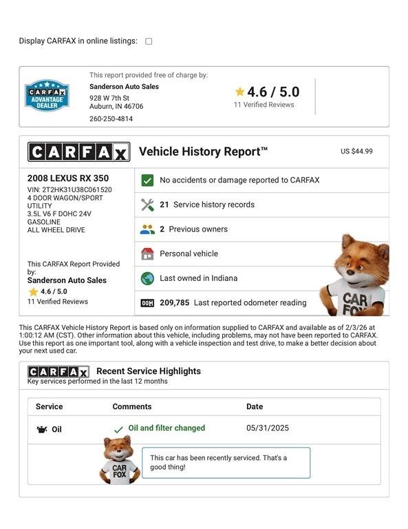 ALL WHEEL DRIVE with heated leather seats, navigation, moonroof, 18 inch wheels, backup camera, keyless entry, power seats, power hatch, and more. This Lexus has been serviced and detailed in our shop. Sanderson Auto Sales has a one price policy. We take the hassle of haggling away by advertising our best price up front. Also, we will never try to sneak in a Documentation Fee or any other type of bogus charge to the final paperwork. Please keep this in mind when shopping for your next vehicle.