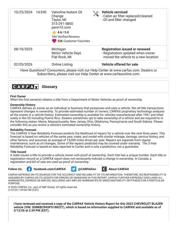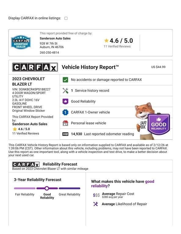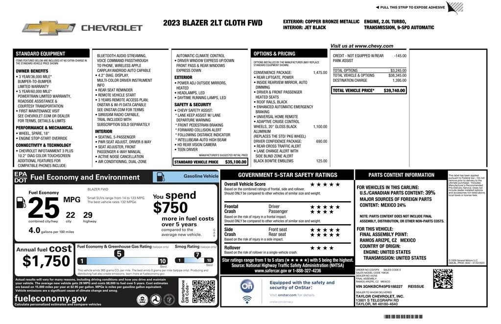 FRONT WHEEL DRIVE 2LT with the 2.0L turbo, 20 inch gloss black wheels, satellite radio, Bluetooth, backup camera, power seat, Apple Carplay, Android Auto, adaptive cruise, blind spot alert, lane keep assist with lane departure warning, forward collision alert, rear cross-traffic alert, keyless entry with remote start, power liftgate, and more. This Blazer has just been serviced in our shop, professionally detailed, and is ready to go! Sanderson Auto Sales has a one price policy. We take the hassle of haggling away by advertising our best price up front. Also, we will never try to sneak in a Documentation Fee or any other type of bogus charge to the final paperwork. Please keep this in mind when shopping for your next vehicle.