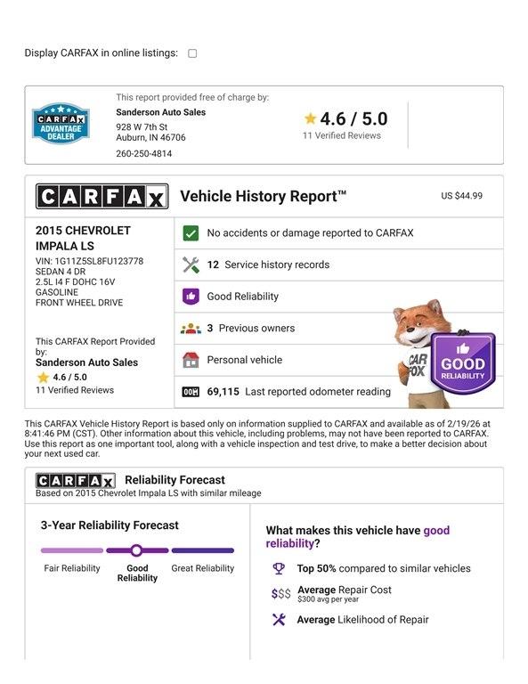 LS with the economical 2.5L, 18 inch gloss black wheels, Bluetooth with satellite radio, power seat, keyless entry with remote start, and more. This Impala has just been serviced in our shop, professionally detailed, and is ready to go! Sanderson Auto Sales has a one price policy. We take the hassle of haggling away by advertising our best price up front. Also, we will never try to sneak in a Documentation Fee or any other type of bogus charge to the final paperwork. Please keep this in mind when shopping for your next vehicle.