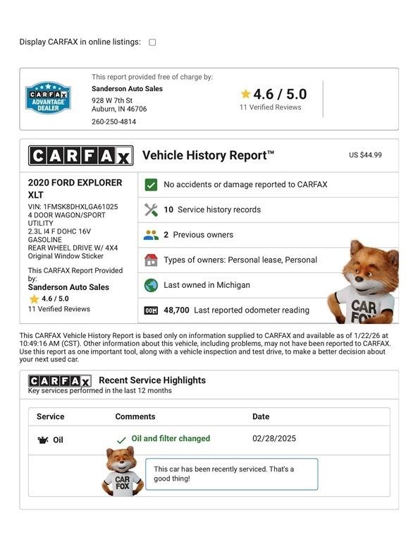 4X4 XLT equipped with the 2.3L turbo, navigation, twin panel moonroof, heated leather seats, heated 2nd row seats, heated steering wheel, 3rd row seat, BRAND NEW TIRES on 20 inch wheels, adaptive cruise, blind spot detection, lane keep, Co-Pilot 360 assist+, power hatch, keyless entry with remote start, Bluetooth, satellite radio, backup camera, power seats, FordPass Connect, Android Auto, and more. This Explorer has been serviced and detailed in our shop and is 100% ready to go. Sanderson Auto Sales has a one price policy. We take the hassle of haggling away by advertising our best price up front. Also, we will never try to sneak in a Documentation Fee or any other type of bogus charge to the final paperwork. Please keep this in mind when shopping for your next vehicle.