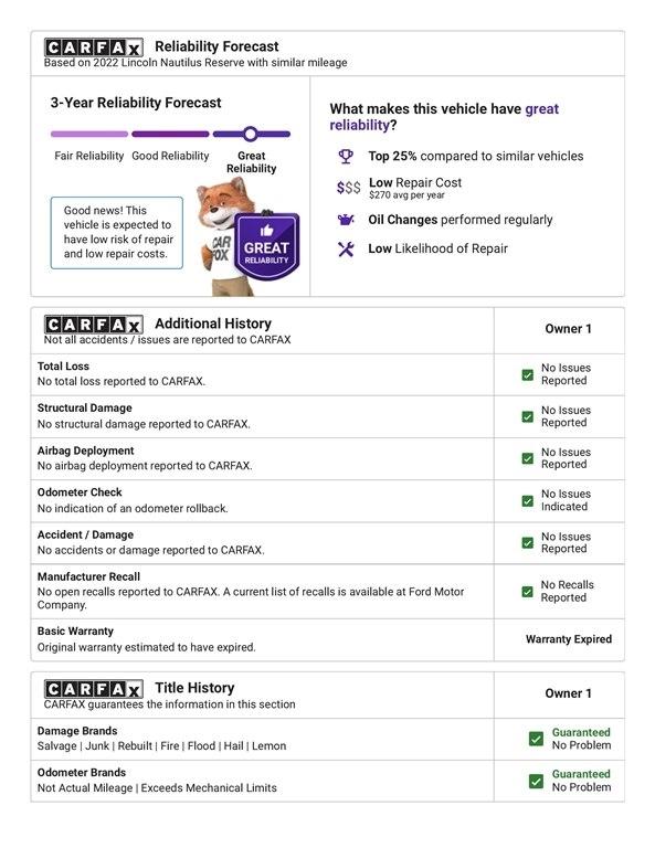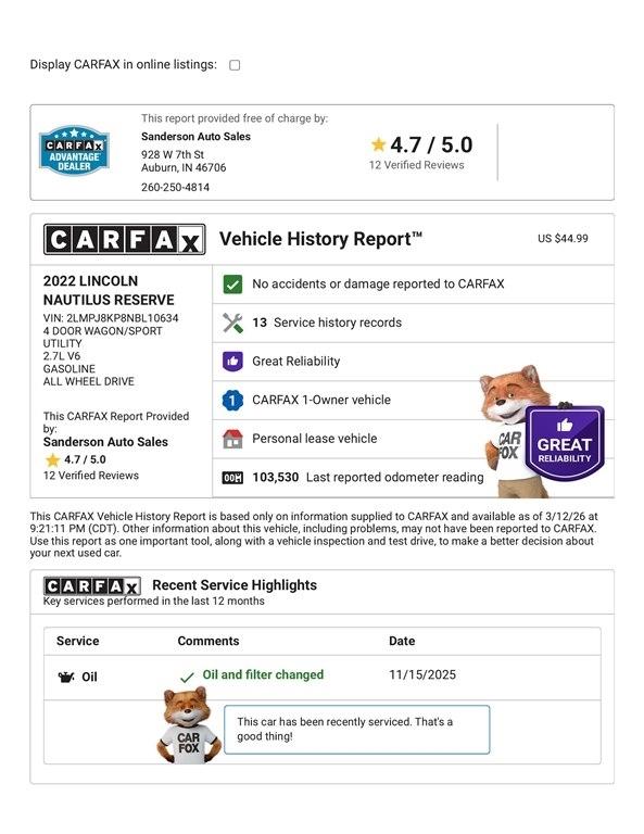 ALL WHEEL DRIVE Reserve with the Luxury package, 335 hp 2.7L Ecoboost, heated and cooled leather seats, heated rear seats, panoramic moonroof, navigation, REVEL satellite radio, Bluetooth, BRAND NEW TIRES on 20 inch wheels, heated steering wheel, backup camera, keyless entry with remote start, power seats, power hatch, blind spot warning, lane keep, cross traffic alert, pre-collision assist, auto parking, Lincoln Connect, Apple Carplay, Android Auto, and more. This Nautilus has been serviced and detailed in our shop. Sanderson Auto Sales has a one price policy. We take the hassle of haggling away by advertising our best price up front. Also, we will never try to sneak in a Documentation Fee or any other type of bogus charge to the final paperwork. Please keep this in mind when shopping for your next vehicle.