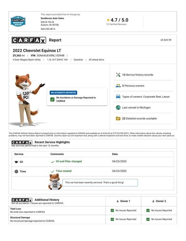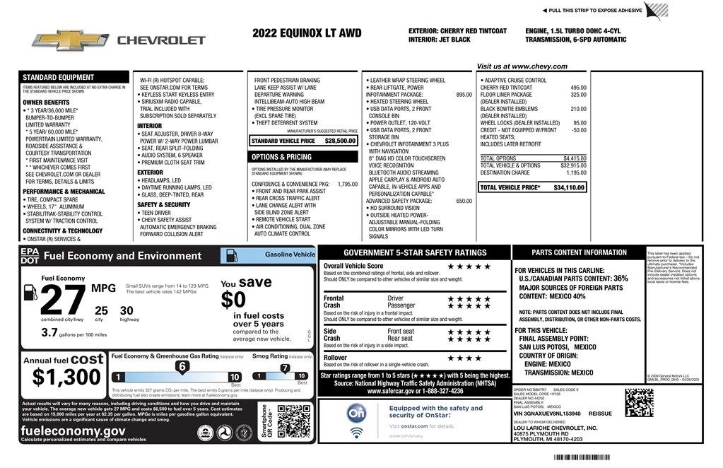 ALL WHEEL DRIVE LT with the 1.5L turbo, heated seats, heated wheel, navigation, confidence nad convenience package, adaptive cruise, forward collision alert, lane change alert with blind zone alert, rear cross-traffic alert, 17 inch wheels, Bluetooth, Wi-Fi, satellite radio, keyless entry with remote start, 360 camera, Apple Carplay, Android Auto, power seat, and more. This Equinox has been detailed and serviced in our shop and is 100% ready to go. Sanderson Auto Sales has a one price policy. We take the hassle of haggling away by advertising our best price up front. Also, we will never try to sneak in a Documentation Fee or any other type of bogus charge to the final paperwork. Please keep this in mind when shopping for your next vehicle.