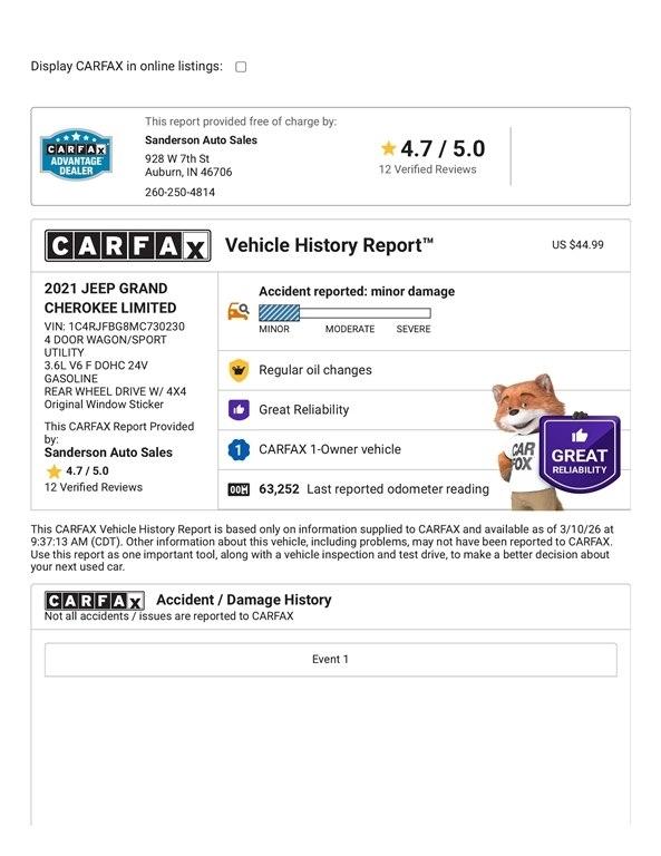 ALL WHEEL DRIVE LIMITED with the 3.6L V6, heated leather seats, panoramic moonroof, navigation, 18 inch wheels, heated steering wheel, backup camera, blind spot detection, cross path detection, keyless entry with remote start, power seats, power hatch, satellite radio, Wi-Fi, Bluetooth and more. This Jeep has been serviced and detailed in our shop. Sanderson Auto Sales has a one price policy. We take the hassle of haggling away by advertising our best price up front. Also, we will never try to sneak in a Documentation Fee or any other type of bogus charge to the final paperwork. Please keep this in mind when shopping for your next vehicle.