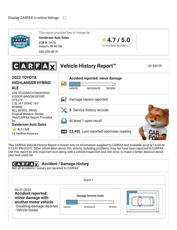 ALL WHEEL DRIVE XLE HYBRID with heated leather seats, moonroof, 18 inch wheels, 3rd row seating, 2nd row bucket seats, power seats, Bluetooth with satellite radio, Wi-Fi, backup camera, blind spot monitor, adaptive cruise, lane keep, Apple Carplay, Android Auto, power hatch, and more. This Toyota has been serviced and detailed in our shop. Sanderson Auto Sales has a one price policy. We take the hassle of haggling away by advertising our best price up front. Also, we will never try to sneak in a Documentation Fee or any other type of bogus charge to the final paperwork. Please keep this in mind when shopping for your next vehicle.