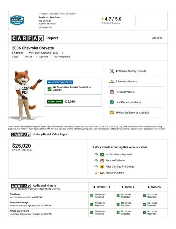 EXTRA CLEAN! 400 hp 6.0L V8, automatic transmission, removable Targa top, power leather seats, keyless entry, chrome 18 inch wheels, and more. Sanderson Auto Sales has a one price policy. We take the hassle of haggling away by advertising our best price up front. Also, we will never try to sneak in a Documentation Fee or any other type of bogus charge to the final paperwork. Please keep this in mind when shopping for your next vehicle.