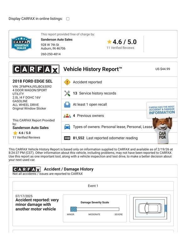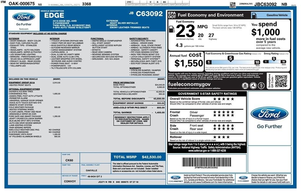 ALL WHEEL DRIVE SEL with the 2.0L Ecoboost, heated leather seats, heated steering wheel, panoramic moonroof, navigation, BRAND NEW TIRES on 18 inch polished wheels, backup camera, power seats, adaptive cruise, lane keep, blind spot monitor, collision alert, hands-free power hatch, keyless entry with remote start, and more. This Edge has been serviced and detailed in our shop. Sanderson Auto Sales has a one price policy. We take the hassle of haggling away by advertising our best price up front. Also, we will never try to sneak in a Documentation Fee or any other type of bogus charge to the final paperwork. Please keep this in mind when shopping for your next vehicle.