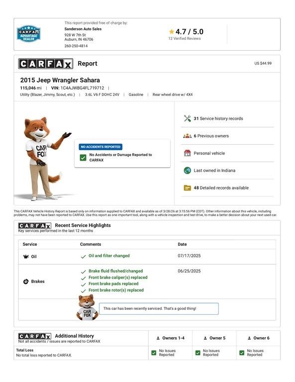 4x4 SAHARA with a hardtop, 6 speed manual transmission, heated leather seats, Kenwood CD player, Bluetooth, 18 inch wheels, keyless entry, power locks, power windows, and more. This Jeep has been serviced in our shop, professionally detailed, and is ready to go! Sanderson Auto Sales has a one price policy. We take the hassle of haggling away by advertising our best price up front. Also, we will never try to sneak in a Documentation Fee or any other type of bogus charge to the final paperwork. Please keep this in mind when shopping for your next vehicle.
